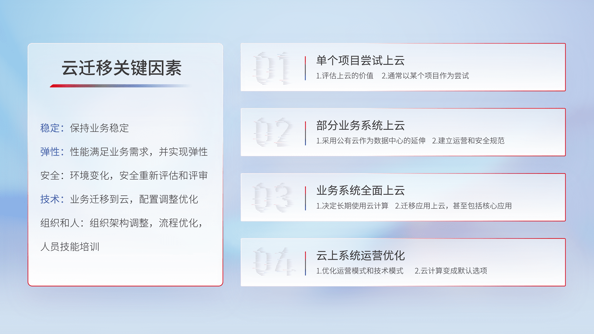 结合实际业务,,从规划设计、、、、云平台选型、、云原生改造、、数据迁移、、、集成交付,,,迁移全过程为客户识别最佳上云路径,,,做好风险识别管理,,,设计网络架构、、、、身份权限、、、、安全审计合规、、、操作审计、、、、日志审计、、监控告警策略、、、、多站点容灾设计等,,,对云上基础设施进行整体规划,,提升IT治理水平,,,以满足弹性、、、高可用、、、高性能的需求。。。。