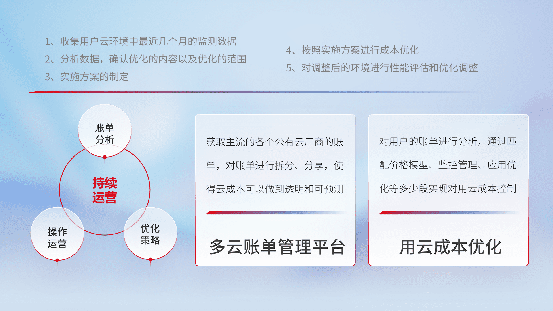 通过多云纳管,,,以统一的资源数据模型把客户的云资源进行抽象和封装,,,,进而实现对多云资源的统一操作,,保障云资源管理的可靠性、、稳定性与可用性。。。量身定制化运维内容,,,,配置、、、开发运维、、补丁管理、、、、备份、、、、监控、、、、认证和访问管理、、、、审计和日常巡检等,,,保障在用云过程中的可靠度,,,,稳定度以及高可用率。。
